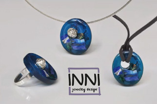Vanuit de combinatie van materialen die Nicole gebruikt in haar schilderijen zijn INNI sieraden ontstaan. Delen van haar schilderijen komen terug in de sieraden en zijn ingesloten in een kunsthars.